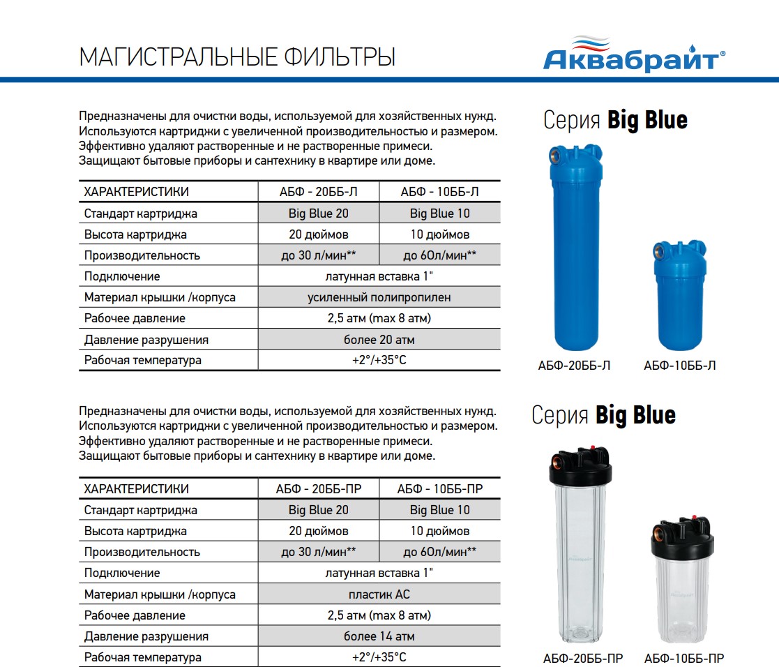 Фильтры АКВАБРАЙТ стандарта Big Blue – это неотъемлемая часть системы водоочистки и водоподготовки там, где требуются значительные объемы очищенной воды, однако такие фильтры можно использовать и в системе водоочистки собственной квартиры, если позволяют условия подключения к водопроводной магистрали.