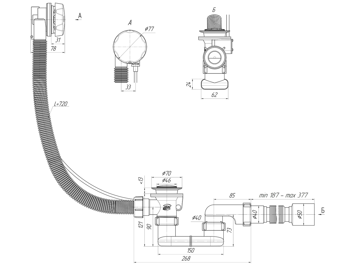 Перелив полуавтомат для ванны длина троса 780мм материал ручки металл