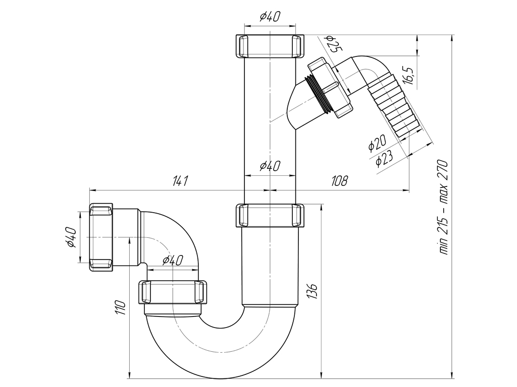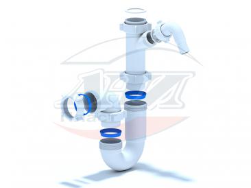 Сифон для кухонной мойки прямоточного (проточного, трубного) типа, с отводом для подключения бытовой техники. Без выпуска, выход для подключения к канализации 40мм
