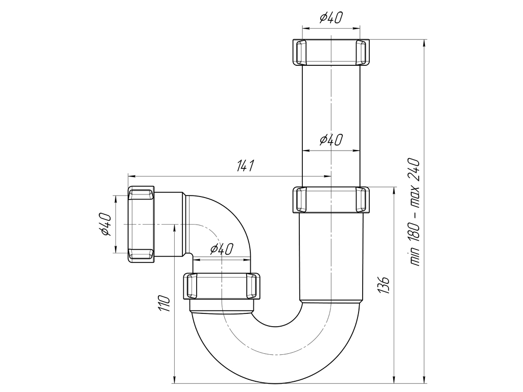 Сифон для кухонной мойки прямоточного (проточного, трубного) типа. Без выпуска, выход для подключения к канализации 40мм