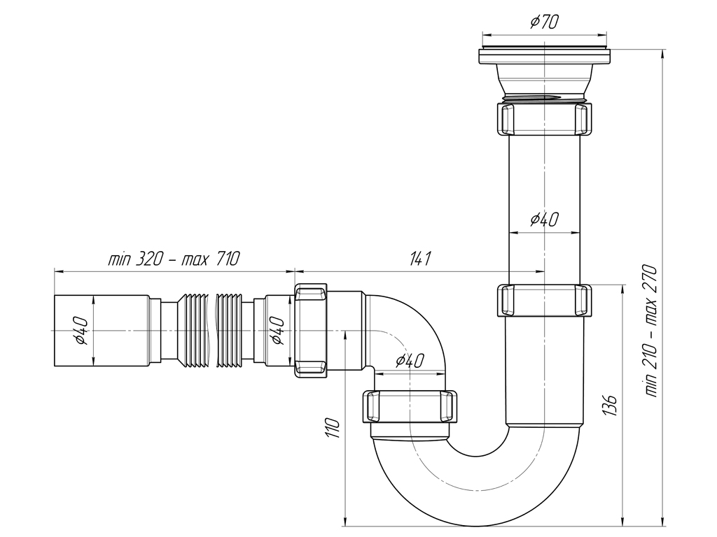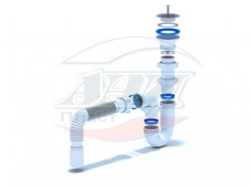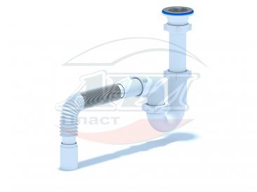 Сифон для кухонной мойки с диаметром сливного отверстия 50мм, прямоточного (проточного, трубного) типа. С разборным выпуском и нержавеющей решеткой, для подключения к канализации комплектуется гибкой трубой 40*40мм
