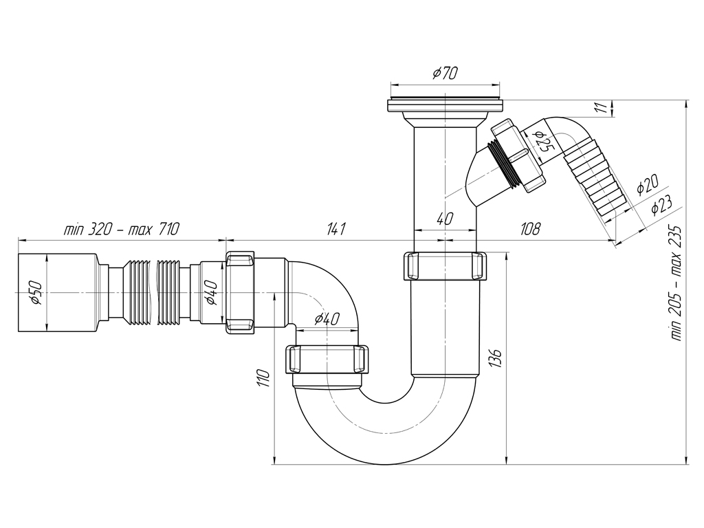 Сифон для кухонной мойки с диаметром сливного отверстия 50мм, прямоточного (проточного, трубного) типа. С литым выпуском и нержавеющей решеткой. С отводом для стиральной машины, для подключения к канализации комплектуется гибкой трубой 40*50мм