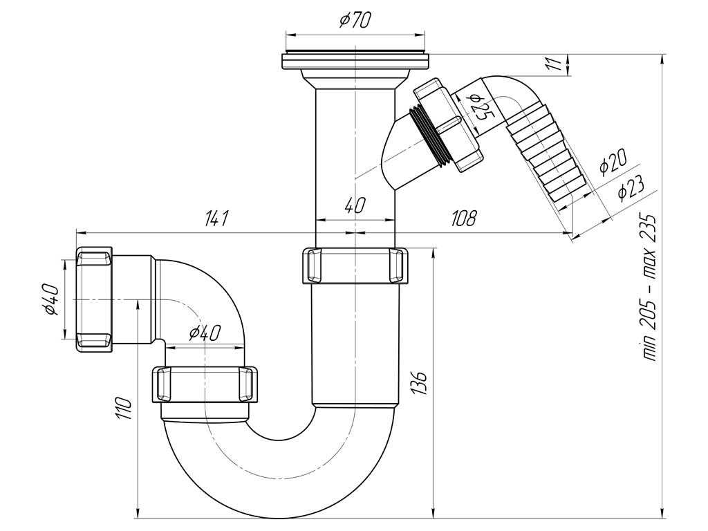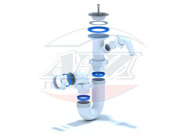 Сифон для кухонной мойки с диаметром сливного отверстия 50мм, прямоточного (проточного, трубного) типа. С литым выпуском и нержавеющей решеткой. С отводом для стиральной машины, выход для подключения к канализации 40мм