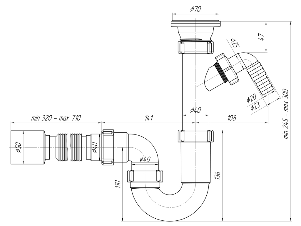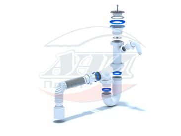 Сифон для кухонной мойки с диаметром сливного отверстия 50мм, прямоточного (проточного, трубного) типа. С разборным выпуском и нержавеющей решеткой, с отводом для подключения бытовой техники. Для подключения к канализации комплектуется гибкой трубой 40*50мм