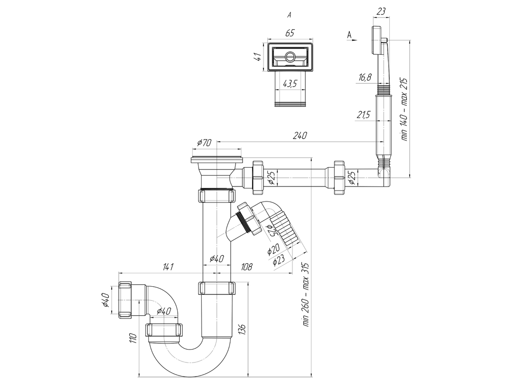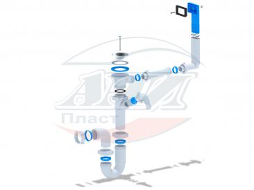 Сифон для кухонной мойки с диаметром сливного отверстия 50мм, прямоточного (проточного, трубного) типа. С разборным выпуском и нержавеющей решеткой, с отводом для подключения бытовой техники. С жестким прямоугольным переливом для моек из нержавеющей стали. Выпуск перелива оборудован универсальной прокладкой для круглых и прямоугольных моек, нужная сторона прокладки достигается путем переворота. Выход для подключения к канализации 40мм