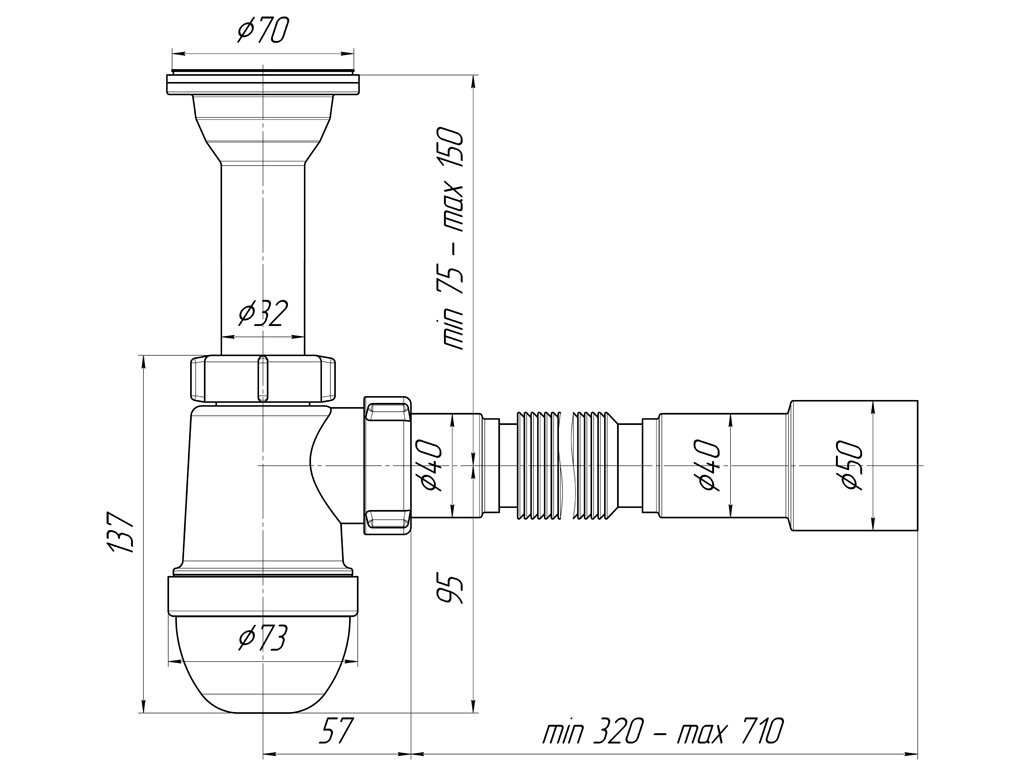 Сифон для кухонной мойки с диаметром сливного отверстия 50мм, бутылочного типа. С литым выпуском и нержавеющей решеткой, для подключения к канализации комплектуется гибкой трубой 40*40/50мм