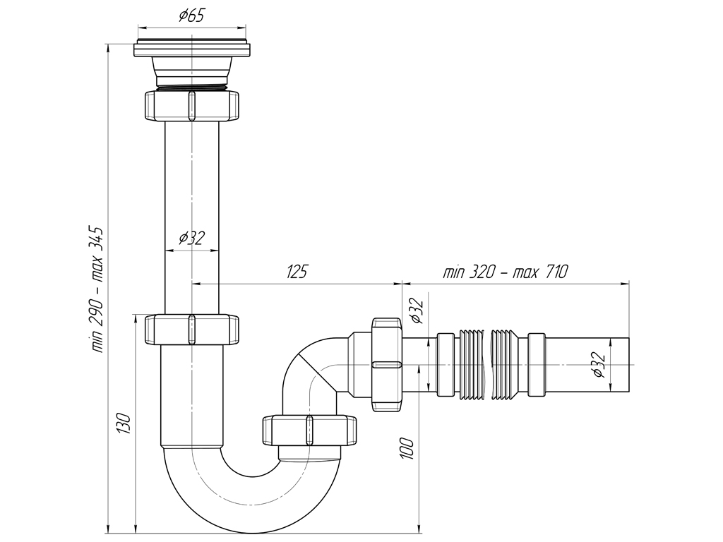 Сифон АНИ 1 1/4’*32 прямоточный с гибкой трубой 32*32