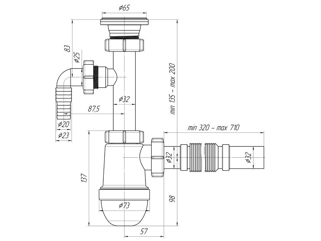 Сифон АНИ 1 1/4’*32 с отводом для стиральной машины, с гибкой трубой 32*32