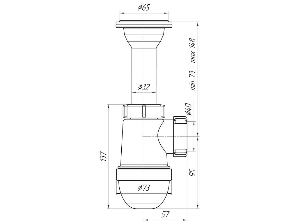 Сифон для умывальника бутылочного типа с нержавеющей решеткой 65мм. С литым выпуском, выход для подключения к канализации 40мм