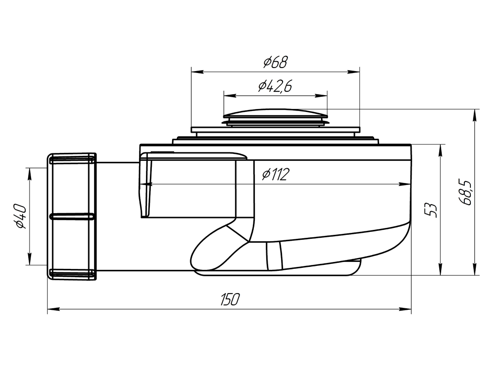 Сифон для душевого поддона со сливным отверстием 50мм. Монтажная высота 53мм