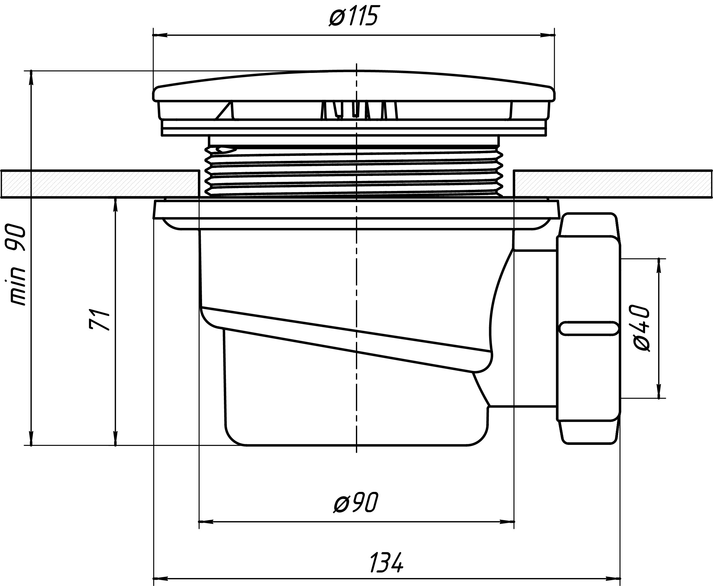 Сифон для душевого поддона со сливным отверстием 90мм. Монтажная высота 77мм