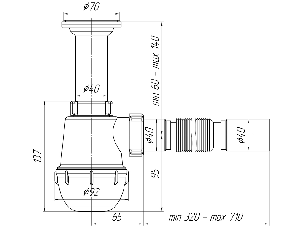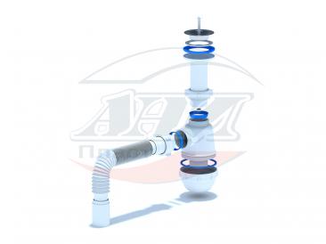 Сифон для кухонных моек с диаметром сливного отверстия 50мм, бутылочного типа с увеличенным корпусом. С литым выпуском и нержавеющей решеткой. Для подключения к канализации комплектуется гибкой трубой 40*40мм