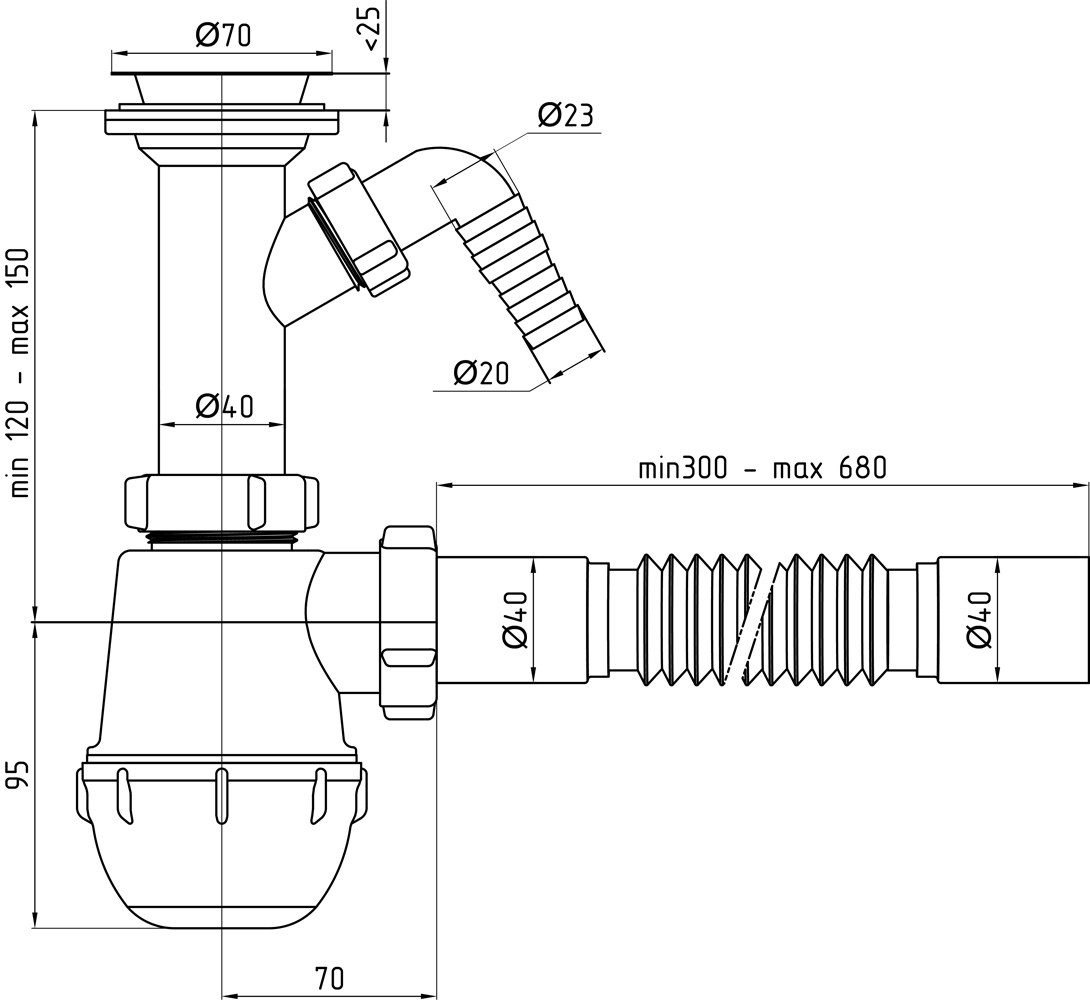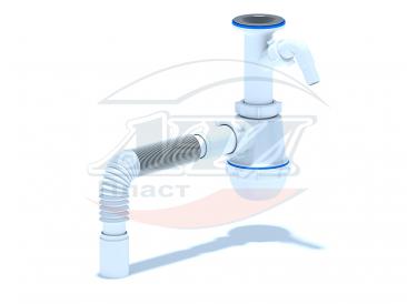 Сифон для кухонной мойки с диаметром сливного отверстия 50мм, бутылочного типа с увеличенным корпусом. С литым выпуском и нержавеющей решеткой. С отводом для стиральной машины, для подключения к канализации комплектуется гибкой трубой 40*40мм