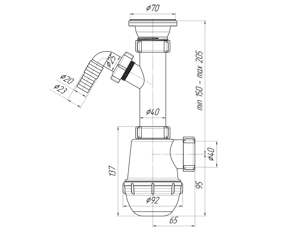 Сифон для кухонных моек с диаметром сливного отверстия 50мм, бутылочного типа с увеличенным корпусом. С разборным выпуском и нержавеющей решеткой, с отводом для подключения бытовой техники. Выход для подключения к канализации 40мм