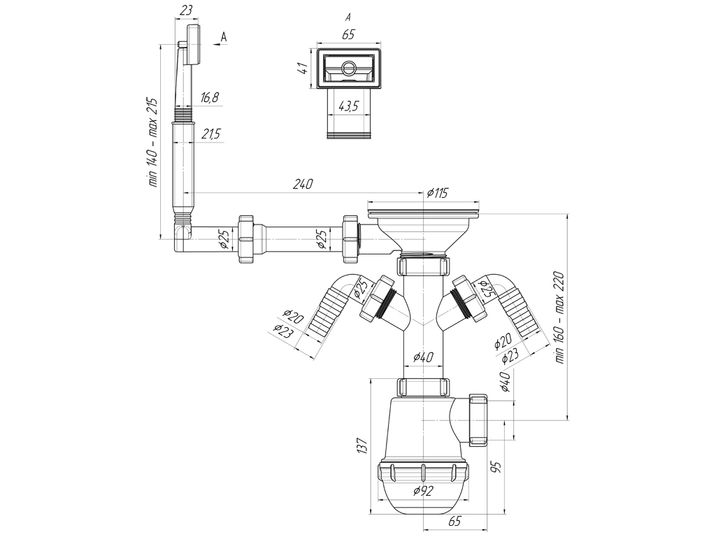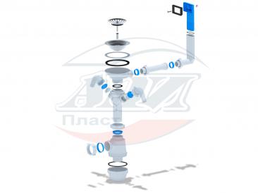 Сифон для кухонных моек с диаметром сливного отверстия 50мм, бутылочного типа с увеличенным корпусом. С разборным выпуском и нержавеющей решеткой диаметром, с жестким прямоугольным переливом для моек из нержавеющей стали. Выпуск перелива оборудован универсальной прокладкой для круглых и прямоугольных моек, нужная сторона прокладки достигается путем переворота. С двумя отводами для подключения бытовой техники. Выход для подключения к канализации 40мм