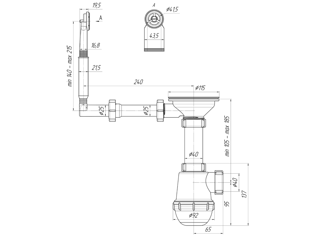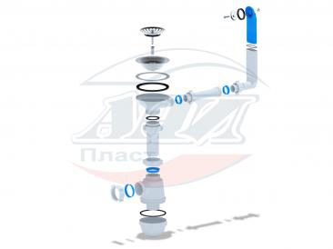 Сифон для кухонных моек с диаметром сливного отверстия 90мм, бутылочного типа с увеличенным корпусом. С разборным выпуском и нержавеющей решеткой, с жестким круглым переливом для моек из композитных материалов. Выход для подключения к канализации 40мм