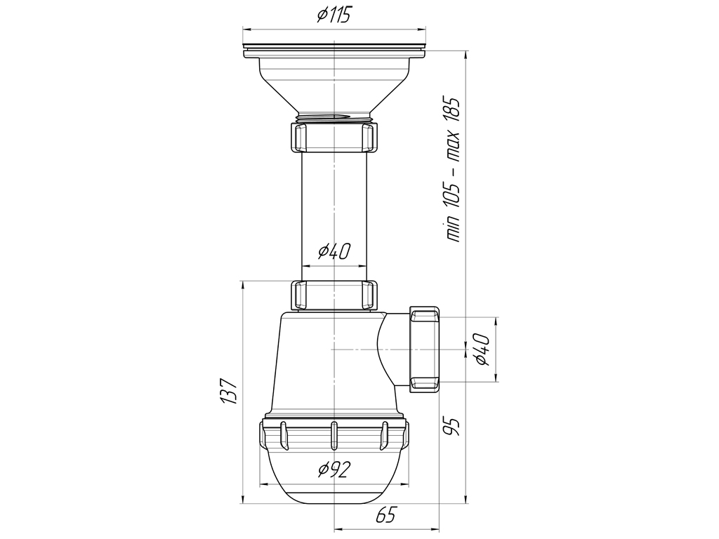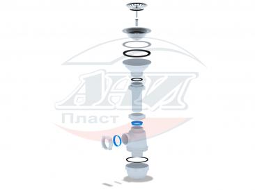 Сифон для кухонных моек с диаметром сливного отверстия 90мм, бутылочного типа с увеличенным корпусом. С разборным выпуском и нержавеющей решеткой, выход для подключения к канализации 40мм