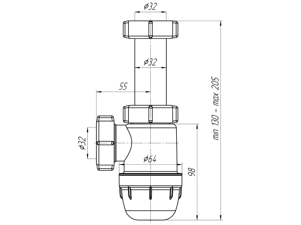 Сифон для умывальника бутылочного типа с уменьшенным корпусом. Без выпуска. Выход для подключения к канализации 32мм