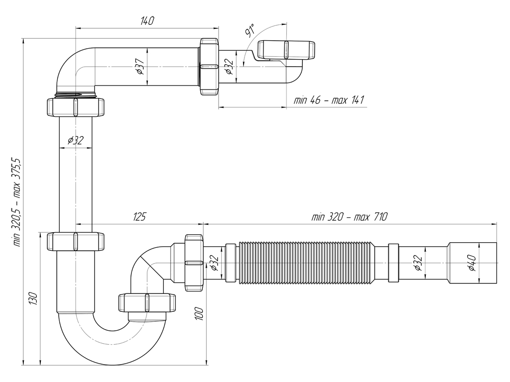 Сифон для умывальника 1 1/4 х 32 без выпуска с гибкой трубой 32х32/40
