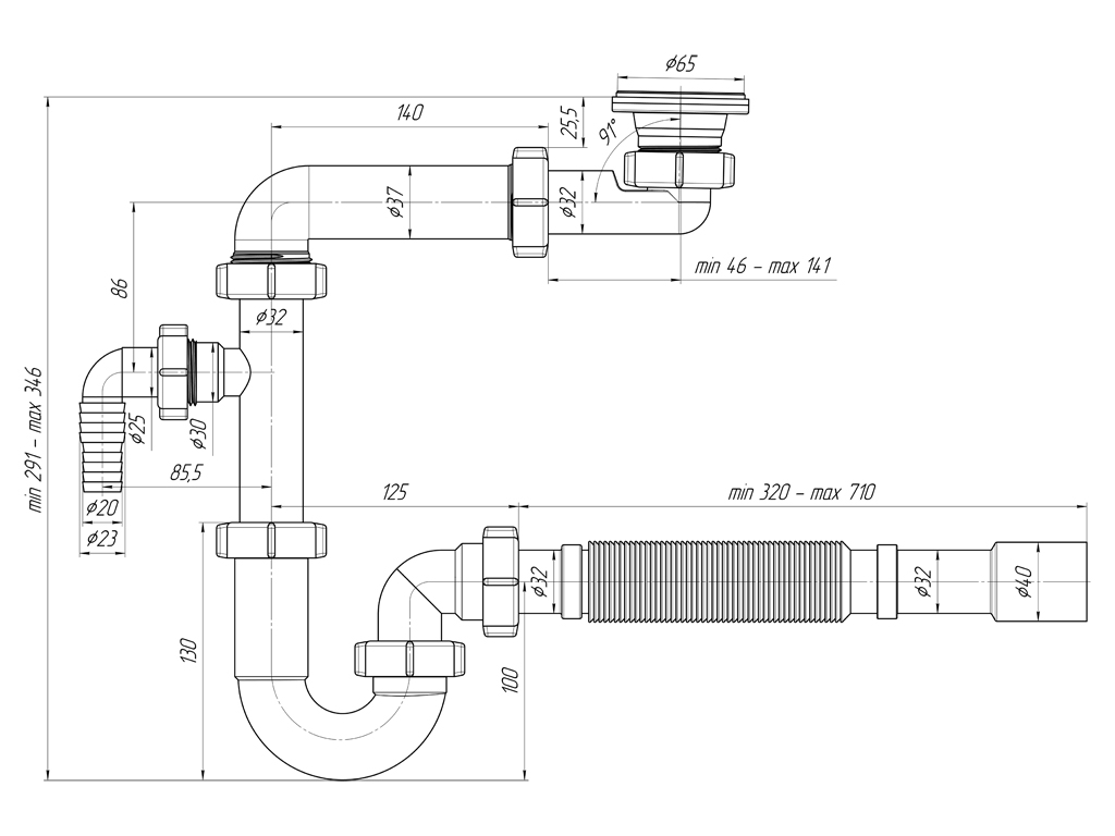 Сифон для умывальника 1 1/4 х 32 с отводом для ст. машины с гибкой трубой 32х32/40