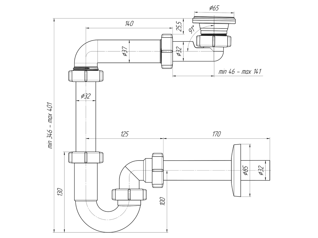 Сифон для умывальника 1 1/4 х 32 с прямой трубой 32